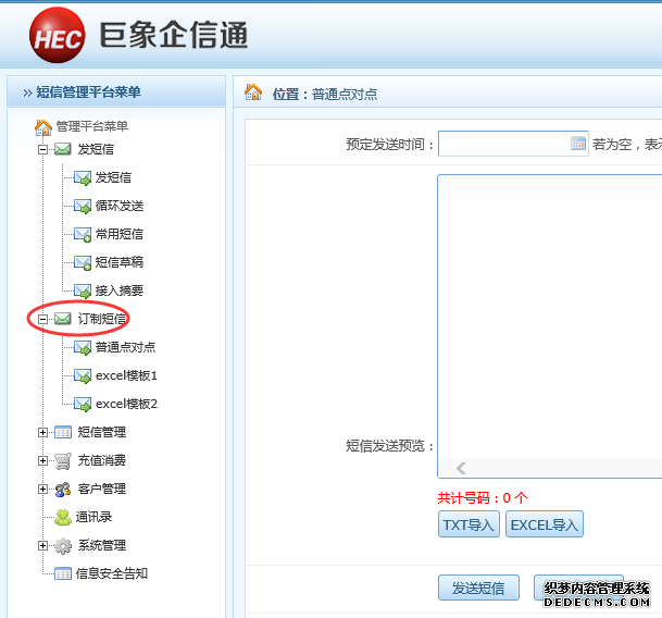 二、內(nèi)容有變量(如內(nèi)容里需插入稱呼、工資明細、物業(yè)管理費明細、快遞單號)的短信群發(fā)操作請選擇界面上左側(cè)導航條中的訂制短信,有三個模板供選擇
