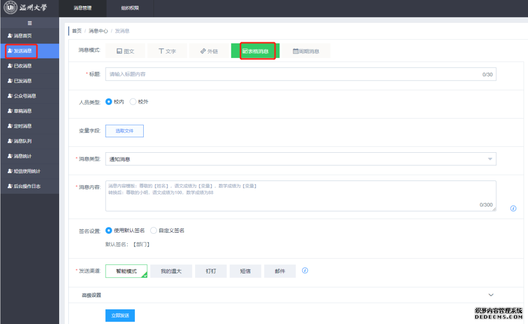 二、點擊左側(cè)菜單欄的“發(fā)送消息”,消息模式選擇“表格消息”。消息標(biāo)題請自行填寫,僅后臺可見,用于發(fā)件人內(nèi)容管理,接收人的短信內(nèi)不顯示。