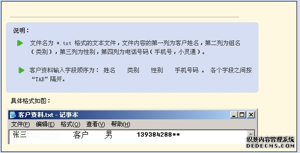 如果您的數據是文本格式,第一列為手機號,第二列為姓名,第一列與第二列之間用TAB鍵隔開。