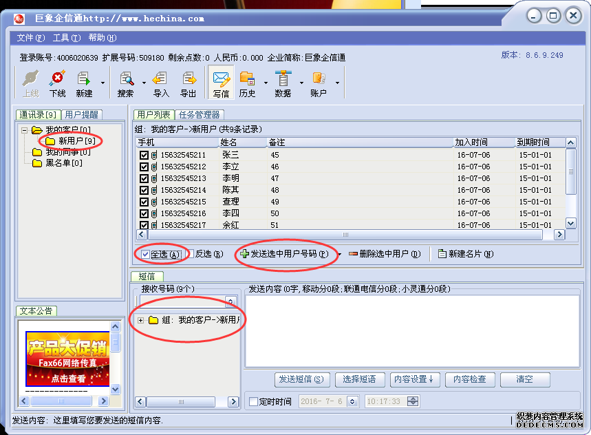 選擇所要發送號碼的文件夾,在號碼前畫∨再點“發送選中用戶號碼”所選號碼將出現在接收號碼對話框中。如下圖所示: