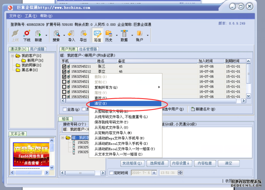 注意:當接收號碼框中已有號碼時,如果不想發送這些號碼,那么在接收號碼框點擊右鍵在彈出的菜單中選擇“清空”號碼就可以。如果不清空,那么信息發送時這些號碼一樣會發送。操作如下圖: